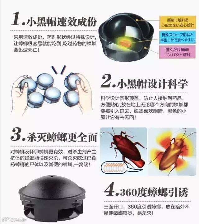 1. 采用速效成分,药剂形状经过特殊设计,让蟑螂很容易就能吃到。吃过药物的蟑螂会迅速死亡。