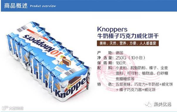 挡不住的5层美味诱惑!近期风靡零食界的德国Knoppers牛奶榛子巧克力威化饼干入战跨境啦!一包一大块超级好吃的威化饼干,香滑的华夫饼,夹上浓郁的巧克力酱,激发出无可停止的美味,快和好友分享吧!