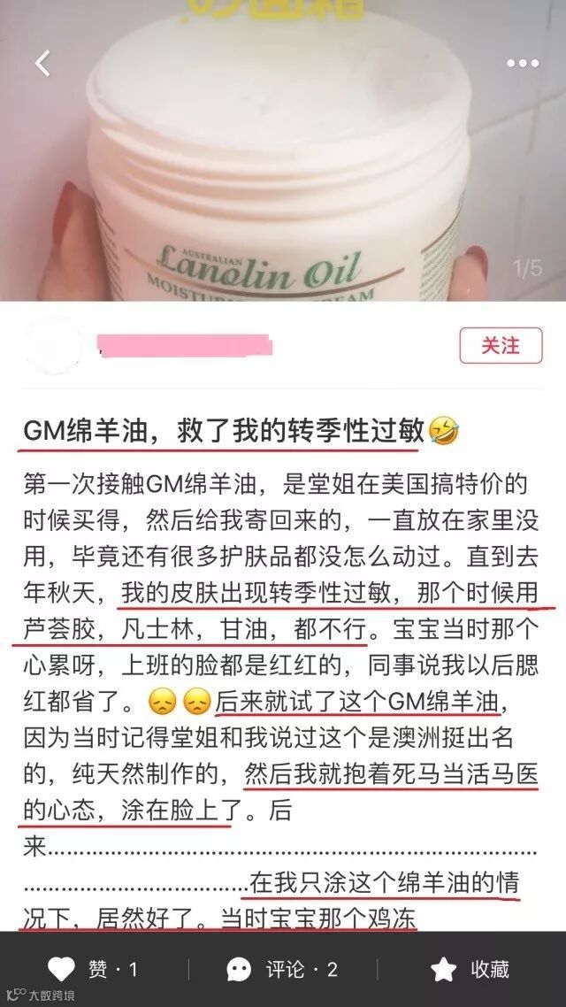 澳洲G&M绵羊油含纯天然绵羊油和维生素E,适合所有肤质。能使肌肤细腻柔软的同时,减小肌肤细纹及皱纹的产生,对于因家务、气温及空调带来的影响也有很好的保护作用。