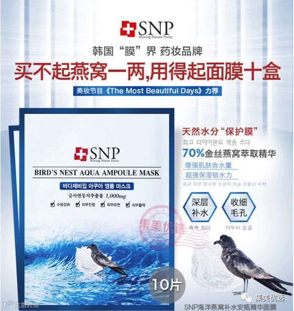 韩国SNP海洋药妆水库面膜10片装,柔软的纤维分子面膜布,比蚕丝梗有韧性,富含燕窝精华,深层补水,收缩毛孔,能够紧紧的将面膜精华吸附在膜布上,而且非常亲肤,敷在脸上不会轻易滴脱落,满满的精华液。补水保湿,用完感觉脸上很舒服,超级补水,敷20分钟后感觉脸上还是湿润润的,用过脸部滋润白净,不黏腻。