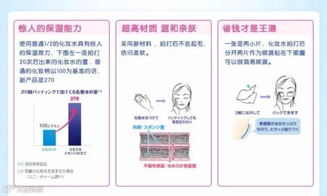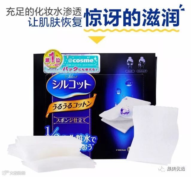 日本COSME大赏化妆棉类第一!最好用的化妆棉!只要用1/2的爽肤水就令人惊奇的化妆棉布。日本连续10年销售量NO.1,尤妮佳不留棉絮的化妆棉 ,采用天然棉成份,经高温消毒,特许制法不含各种荧光剂和添加料。 特别有效的贴近肌肤,彻底卸除面膜及妆容,质地格外柔韧顺滑,用后不留残屑。