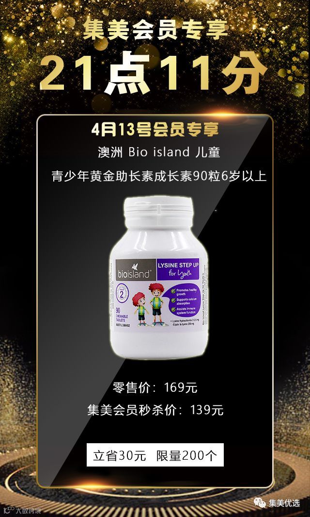 4月13日,21:11,澳洲 Bio island 儿童青少年黄金助长素成长素 90粒 6岁以上,原价169元,建议零售价139元,限量200份,手慢无!!!