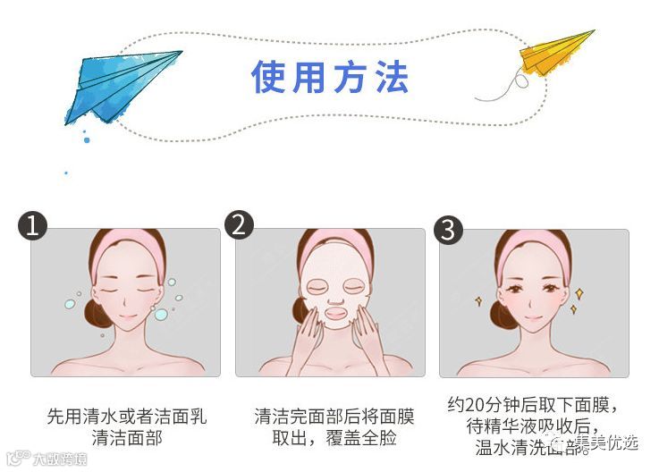 洁面后,拍上适量的化妆水,之后敷上面膜,约10-15分钟(视皮肤吸收速度而定)后取下面膜,再以指腹轻拍按摩肌肤,待精华液充分吸收后涂上适量的乳液或者面霜。