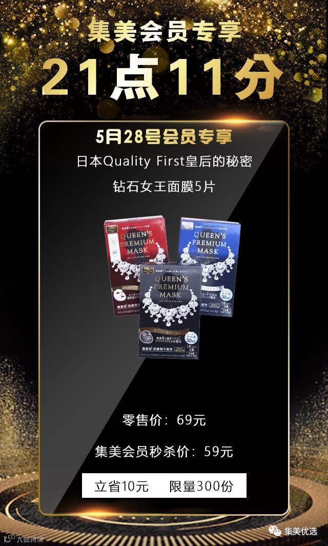 5月26日,21:日本Quality First皇后的秘密钻石女王面膜5片,原价69元,建议零售价59元,限量200份,手慢无!!!