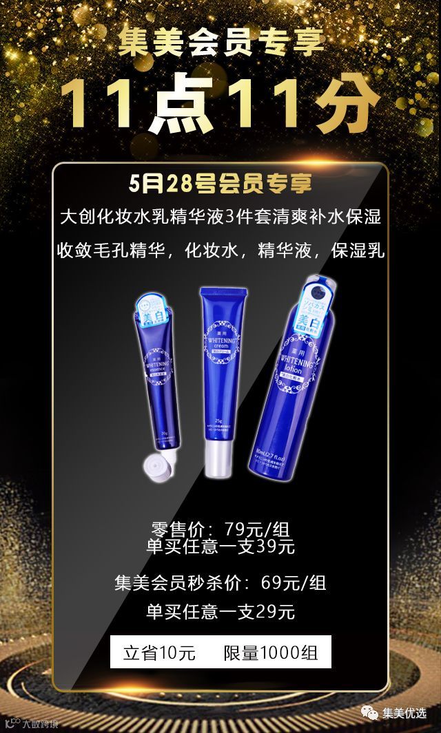 5月28日,11:11,大创化妆水乳精华液3件套清爽补水保湿收敛毛孔精华,一盒原价79元,建议零售价69元,限量各1000份,限量100份手慢无!!!