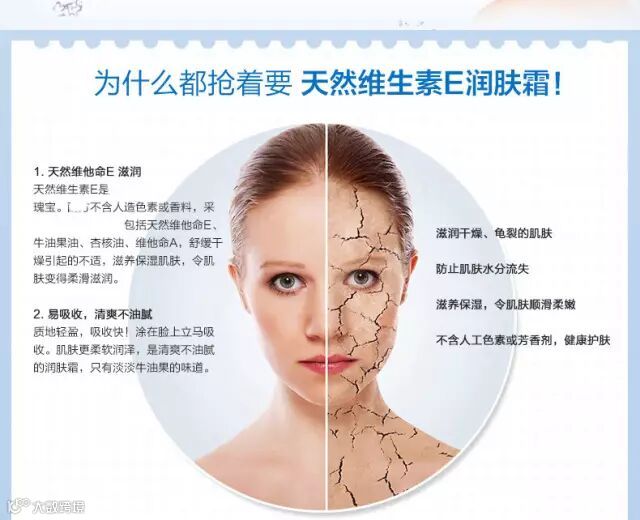 维E软膏在维生素E的作用下,女性皮肤免受自由基的伤害、防止皮肤衰老、防止脂褐素沉着于皮肤、阻止生理性色素色斑的产生;并且,对不慎受紫外线灼伤的皮肤,维生素E还能起到良好的修护作用。