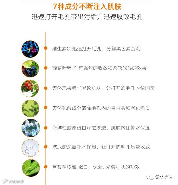 除了含有天然乳酸苹果酸。软化角栓。清除毛孔内的黑白头和老化角质。促进皮肤新陈代谢。还添加了玻尿酸。胶原蛋白等高保湿成分。收缩毛孔的同时给肌肤补充水分。