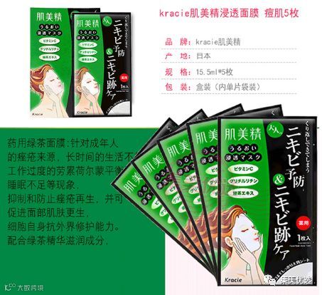 绿色款肌美精面膜内含美白成分维他命C + グルチルリチン成分 + 提取绿茶精华素。具有营养补充、镇定配方和保湿作用。可杀死有害细菌,有效防止暗疮及粉刺的再生,并可促进面部肌肤更生,细胞自身抗外界修护能力。