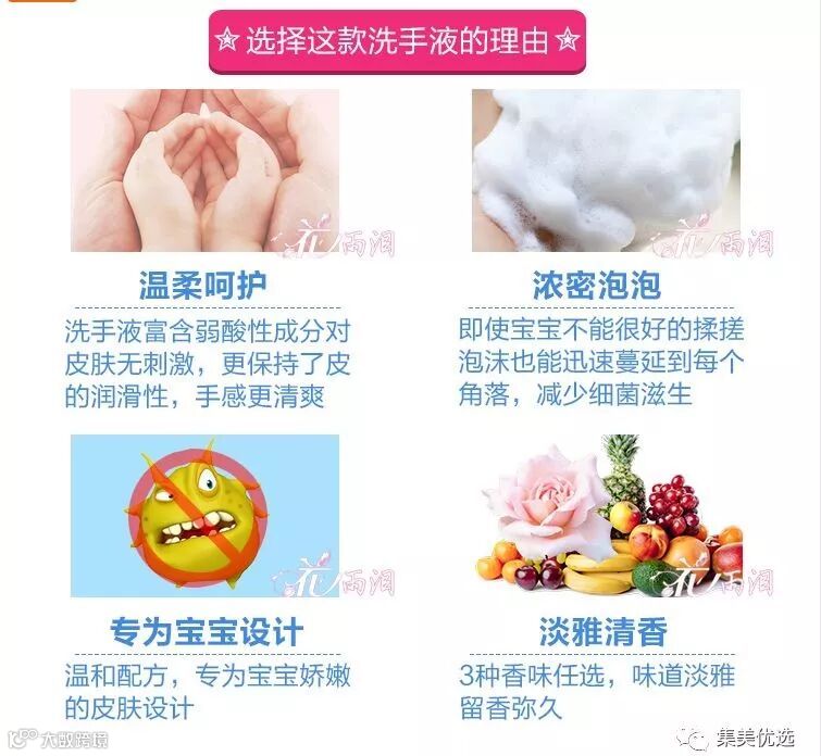 这款日本花王杀菌消毒保湿泡沫洗手液是婴幼儿专用的洗手液,消毒杀菌的同时不伤害宝宝娇嫩的皮肤,以极其细小的泡沫将手上的污渍洗净且与肌肤具有相同的弱酸性,清洁手部的同时也可以保持肌肤的润滑使用后,还会留下淡淡的清香,气味芳香,手感轻爽。没有普通洗手液洗完后的那种滑腻感。特有的泡泡出口设计,让丰盈的泡沫魔法一般出现在宝宝手上,家里的小宝贝们一定会爱上洗手!