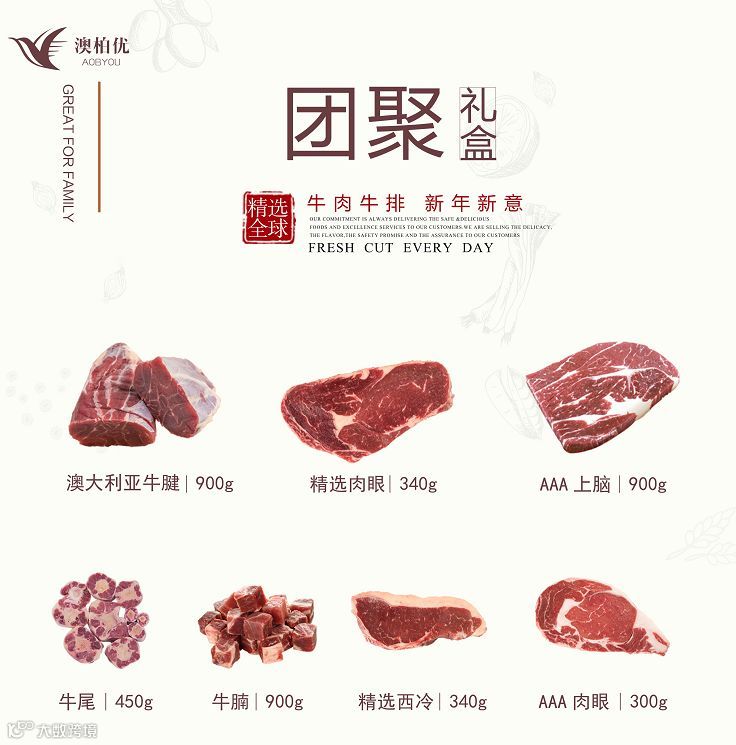 经过精心的挑选与比较,今天我们为大家带来这一款不但适合自己在家吃,拿出去送礼物非常大气且精致的礼盒——澳柏优牛排团圆大礼盒
