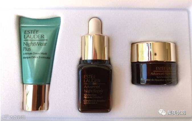 套装包括:DayWear抗氧化日霜15ml(俗称“小黄瓜”)+DayWear抗氧化晚霜15ml+Nightwear plus 3minutes detox mask面膜7ml+ANR小棕瓶精华液7ml+ANR小棕瓶眼霜5ml