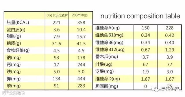 50g卡乐比麦片与200ml牛奶相比较