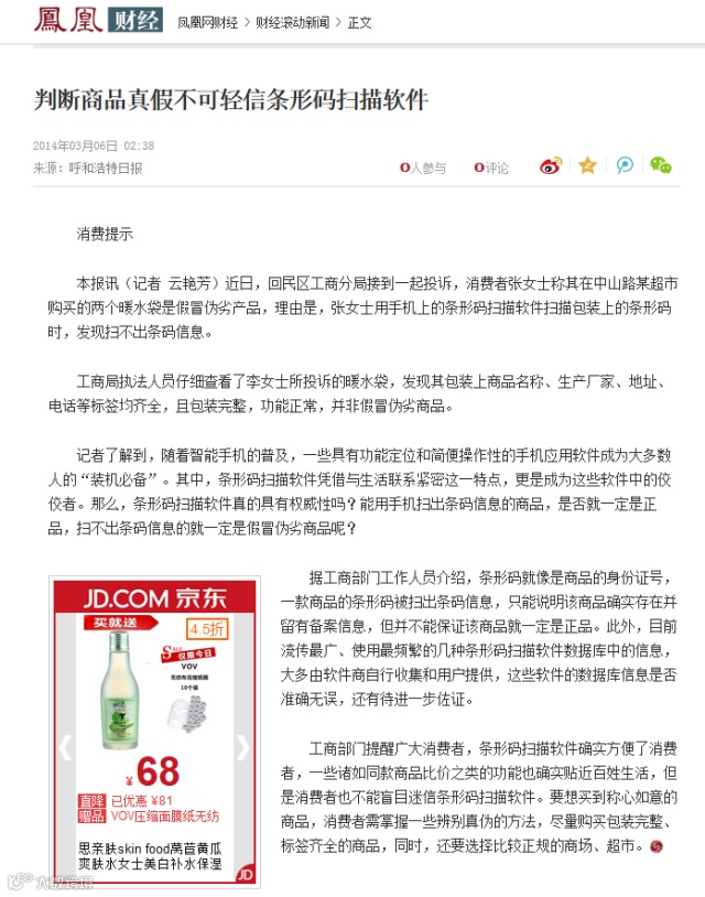 分析:首先软件的数据本身就是不全面的不靠谱的;其次条码二维码是可以复制的。这个和禽流感时大家抢购板蓝根一样,这类软件完全没有分辨真假的功能。造假者是聪明的,现在的复印扫描技术是很先进的,产品的外包装几乎可以做到100%一样,而这类软件只是扫描一下条形码或者二维码,您千万别天真的认为做假货的人不会做个一模一样的条形码出来!这类软件真能分辨真假,我们很多专门进行质检工作的公务员就要卷铺盖卷回家了!