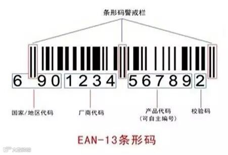 在超市中大家常见到的条码大都属于十三位条码(EAN13)。数字分为厂商识别代码(7位或8位)、商品项目代码(5位或4位)和校验码(第13位)。