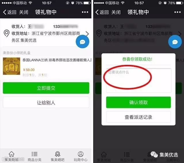 再次检查收货人信息后,点击“立即提交”,再按“确认领取”,则成功领取礼物!如果点击“让给别人”,礼物可被转送给其他好友!