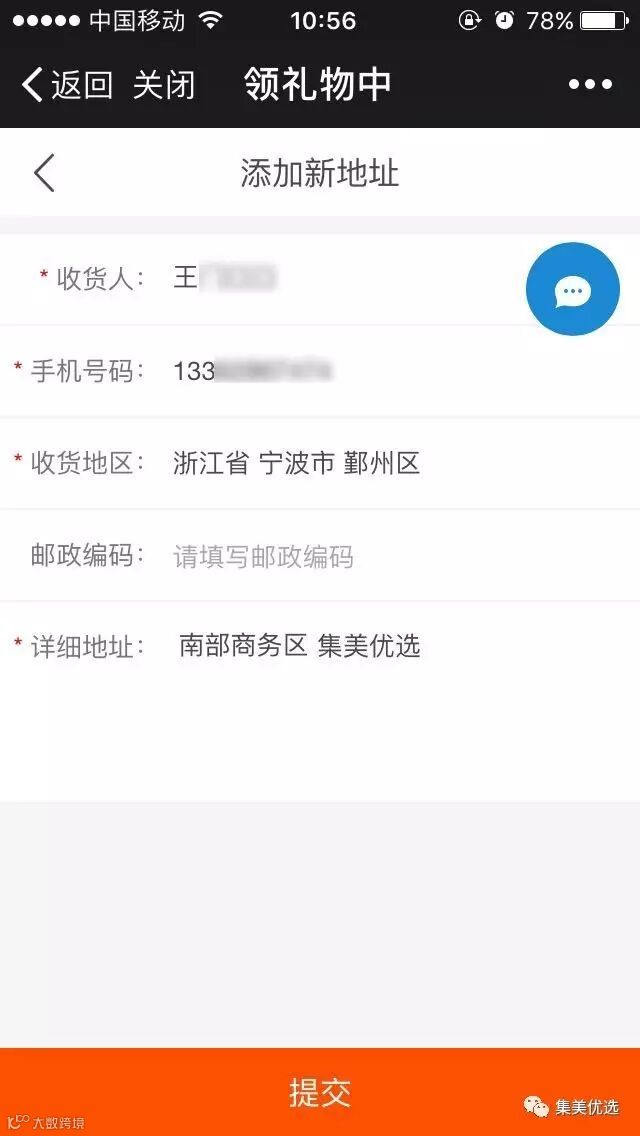 进入到领礼物页面后,需要选择或填写收货人相关信息,然后点击“提交”。