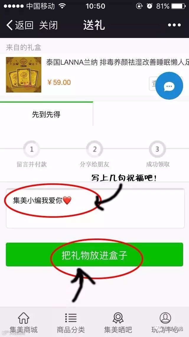 支付成功后,进入礼盒页面。填写祝福后,点击“把礼物放进盒子”。
