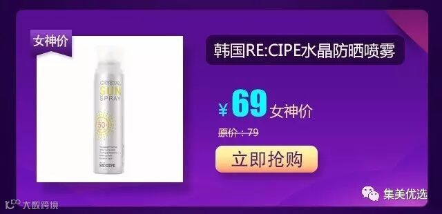 1瓶抵3瓶,相当于防晒霜+隔离亮肤霜+保湿霜。RE:CIPE水晶防晒喷雾,通过食品标准级的韩国国立农产品管理局权威认证,天然有机,不添加不安全的防晒配方。SPF50+,PA+++,让你无惧夏日紫外线!清爽透气不油腻,喷雾包装更易携带使用。