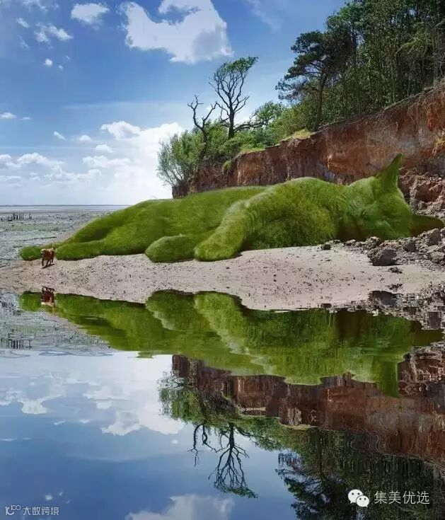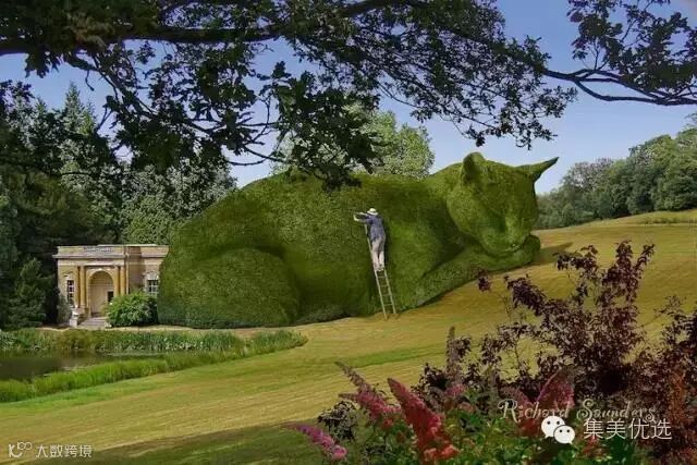 这些图片中睡觉的猫咪安静地躺在美丽的花园里和风景如画的美景中,它的皮毛用灌木丛,草地和树叶来代替,显得安静、美丽而祥和。