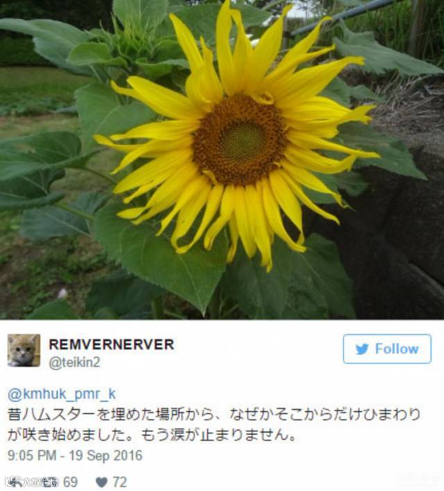 另外还有网友说,在她曾经埋仓鼠的地方长出了一朵向日葵,而且周围什么都没有,只有那里长了向日葵 ↓