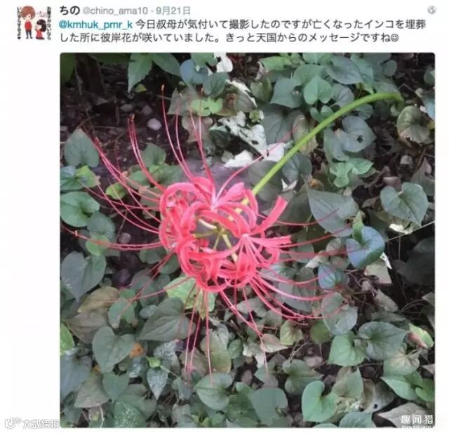 “我姨妈拍到的,在之前埋鹦鹉的地方一朵彼岸花盛开了。我相信,这一定是来自天堂的声音。”