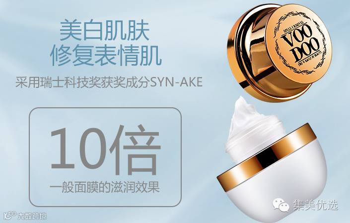专利的蛇毒成分SYN-AKE,又称“蛇毒血清”,是一种三胜肽颗粒,也就是传说中的肉毒杆菌。它能深层抵抗衰老,渗透力远超于普通面膜。超强悍的修复效果,能够对抗痘坑疤痕。其超强的抗氧化和美白能力,对于斑点、色斑、黑色素都有卓越的去除效果。