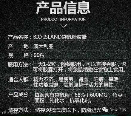 强精补肾改善精力抗疲劳提高机能. Bio Island袋鼠精胶囊源自澳洲优质的袋鼠精选用澳洲野生成年雄性袋鼠的肌肉、生殖器组织提取成分有补肾强精,益气提神之功效。适用人群:肾虚、腰酸背痛的男性 男性性功能减退者 生活不规律、日夜颠倒者病后体虚者