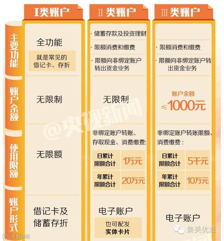简单说,Ⅰ类账户是全功能账户,常见的借记卡就属于Ⅰ类账户;Ⅱ、Ⅲ类账户则是虚拟的电子账户,是在已有Ⅰ类账户基础上增设的两类功能逐级递减,资金风险也逐级递减的账户。