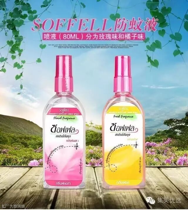 泰国最古老的品牌soffell驱蚊水,soffell是泰国第一驱蚊品牌,最先研制出驱蚊产品,随后引领整个泰国上百家工厂防造此类产品,但soffell至今还是保持着全泰国销量最大,市场占有率最高的产品,可谓风靡全泰国的特效驱蚊水,能有效抵御蚊虫长达7小, 婴儿可用。您是否还为秋天到草地上而害怕,或是野外露营游玩而担心,现在!!!您只需拥有此产品,所有烦恼担心都可统统抛掉!那这个就是哦,非常清爽,婴儿小孩都可以使用哦长达7小时的防蚊效果哦,一晚上孩子能够睡的香香甜甜了哦而且这个乳液的味道也很好闻,很清爽的淡淡的桔子味 ,可以喷在身体上,也可以在睡觉的时候喷在床的周围,大家都知道,秋天的蚊子比巫婆还毒,被蚊子叮了又肿又痒,一抓就留下黑印,还有去户外,特别是晚上去草坪上,蚊子那个多吖,带上这个驱蚊水蚊子就不来喽,简直是驱蚊神器哦