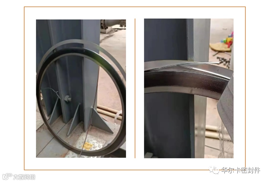 大口径的缠绕垫片无论是否设置了内外环,在保管、拆封、搬运、吊装、安装时,如果不够谨慎,可能会导致缠绕部分从内外环中脱出,甚至完全散架,特别是尺寸超过2000mm的缠绕垫片更容易发生这种情况。当缠绕部分从内外环脱离后,大部分情况下不能修复,导致垫片无法使用。