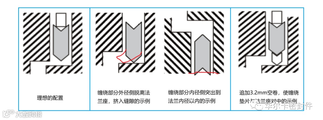 在凹凸面法兰组合(MFM)中使用基本型缠绕垫片,当凹凸两面法兰配合处的缝隙较大时,会出现缠绕垫片与法兰座不能很好对中的情况,特别是当缠绕垫片垂直安装时,处于下部(6点方向)的缠绕垫片的外径侧,可能会在受压后翘曲,挤入法兰缝隙中,而处于上部(12点方向)的缠绕垫片的内径侧,可能会突出到法兰的内径以内,如此一来,缠绕垫片可能会破损或者泄漏。