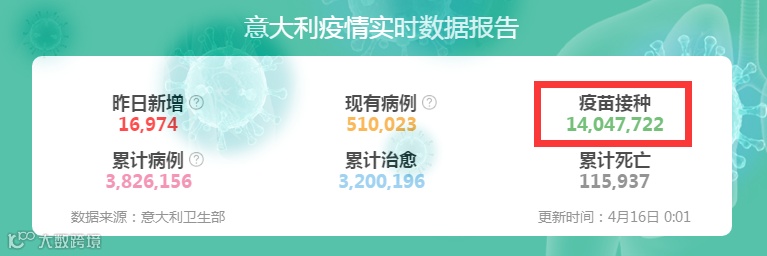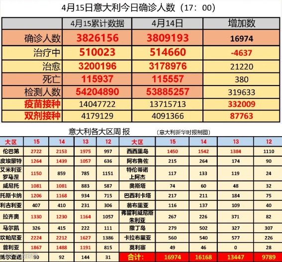 当地时间4月15日,根据意大利卫生部的数据,意大利已有9788805人接种了第一剂疫苗,占人口数的16.4%,4138845人接种了两剂,占人口数的6.94%。