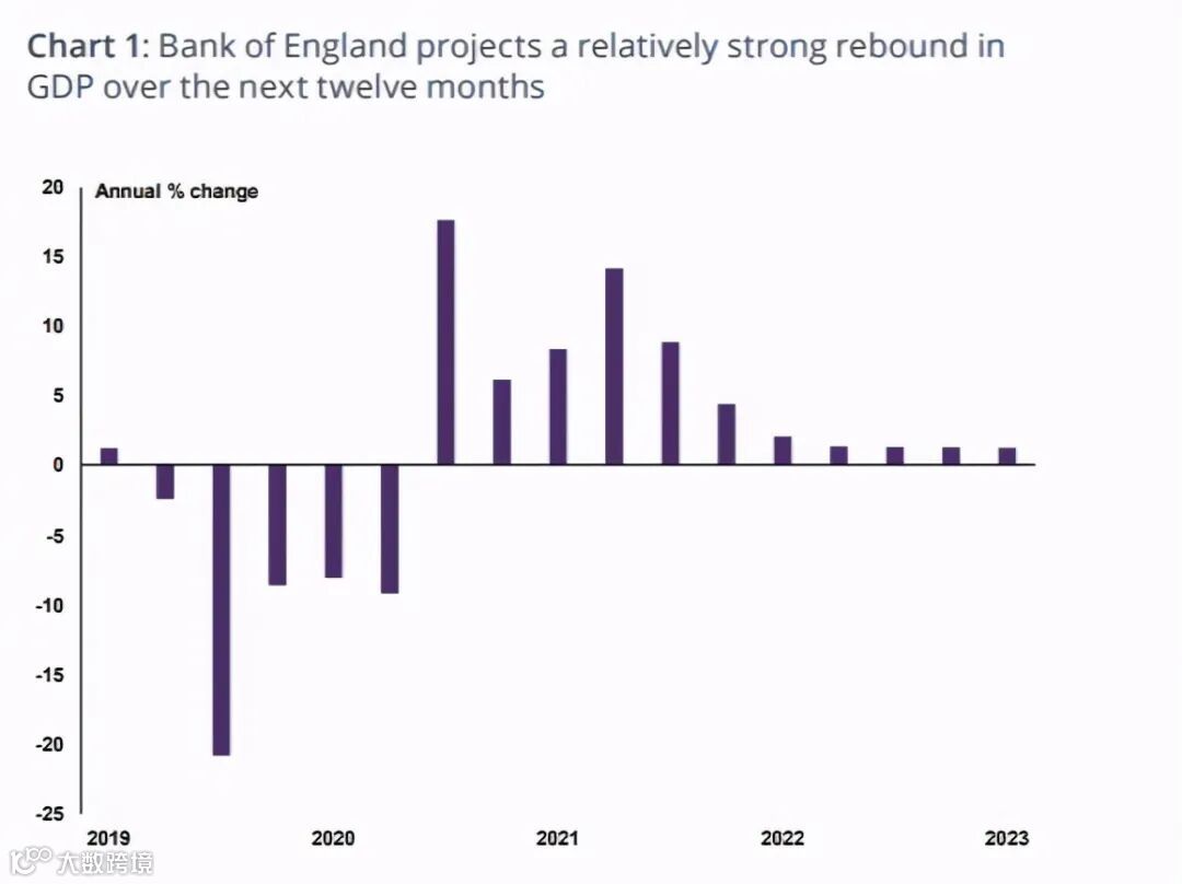 2、英国央行的预测显示,未来12个月GDP将出现相对强劲的反弹,最高年增长率接近20%。