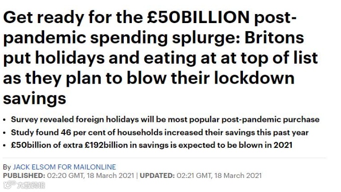 3、另外,据英国央行最新的货币政策报告显示,疫苗的接种让消费者信心大增,已经推动了英国国内度假预订量的增长,且大多数人现在希望生活在一年内恢复正常。无独有偶,商业和经济研究机构CEBR的一份报告也显示,在解除封锁后,英国人将“放肆”吃喝玩乐,准备将500亿英镑被压抑的储蓄用于消费。