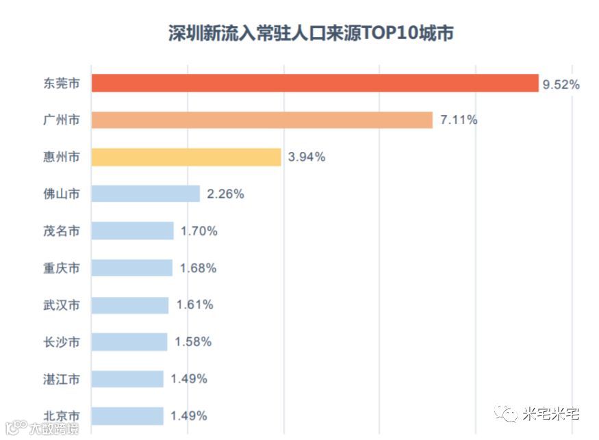 再看一下,广州和深圳的人口结构区别,可以发现深圳市新流入人口来源TOP10城市有6个为省内城市: