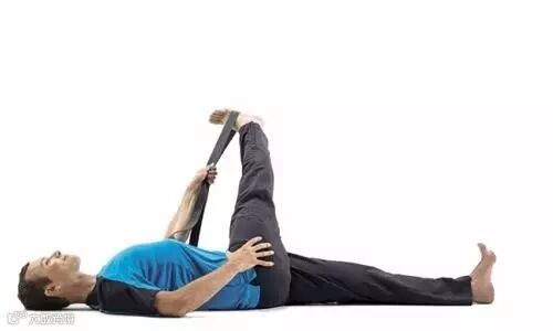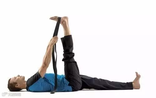 仰卧。把手滑到下腰背后面,确认背部是否维持自然柔和的曲度,保持曲度。用瑜伽带套在右脚脚弓。呼气,向上伸直右腿,把脚踝位于髋部正上方,或者尽可能地把脚抬高。如果大腿后侧太紧张,不妨稍微放松瑜伽带。两脚后跟同时下压,脚尖内勾。保持5个呼吸。最后,呼气,放松返回,换另一侧。