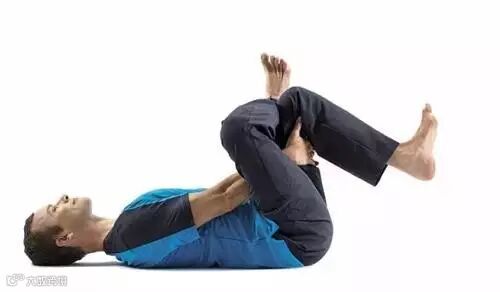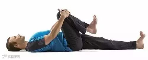 仰卧。呼气,弯曲右膝靠近胸腔,双手抱住右小腿胫骨。保持两个呼吸。在这个以及接下来的4个体式中,不要把下背部压向地面;相反地,应尽可能让下背部保持自然的曲线。缓慢地吸气,放开双手,右腿返回地面。呼气,弯曲左膝靠近胸腔。吸气放松。交换左右腿,重复体式练习,再继续做4次。