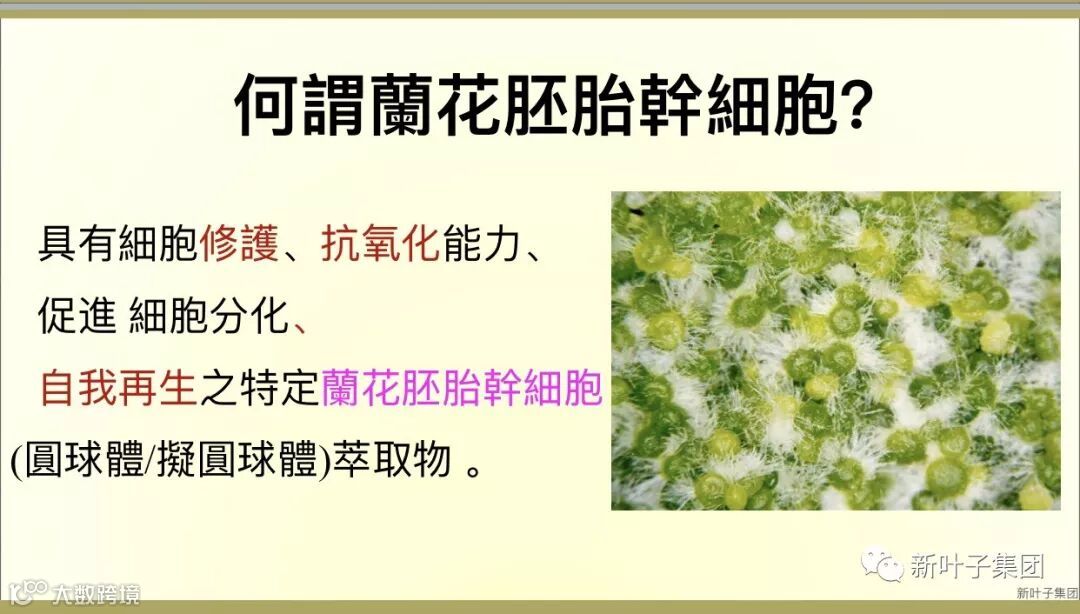 台湾素有兰花王国之称,也是国内外人士都青睐之花卉,而台湾兰花每年产值高达27亿元,產量超过世界60%以上,不论产量和产值均是世界第一,甚至一度超越荷兰,而台湾不仅在兰花培育技术也是世界有名,兰花应用发展科技更是举世无双:新叶子以台湾特有的兰花培育技术与实验室合作,使用颠覆传统生产萃取方式的「超临界萃取」技术,将蝴蝶兰中的胚胎干细胞萃取出来,并配合绿能、无毒、高效之「微胶囊包覆技术」,应用於皮肤保养品中,将惠及全球的爱健康美丽之人士,提供深层次的皮肤维护,更盼卓越技术為爱传承。