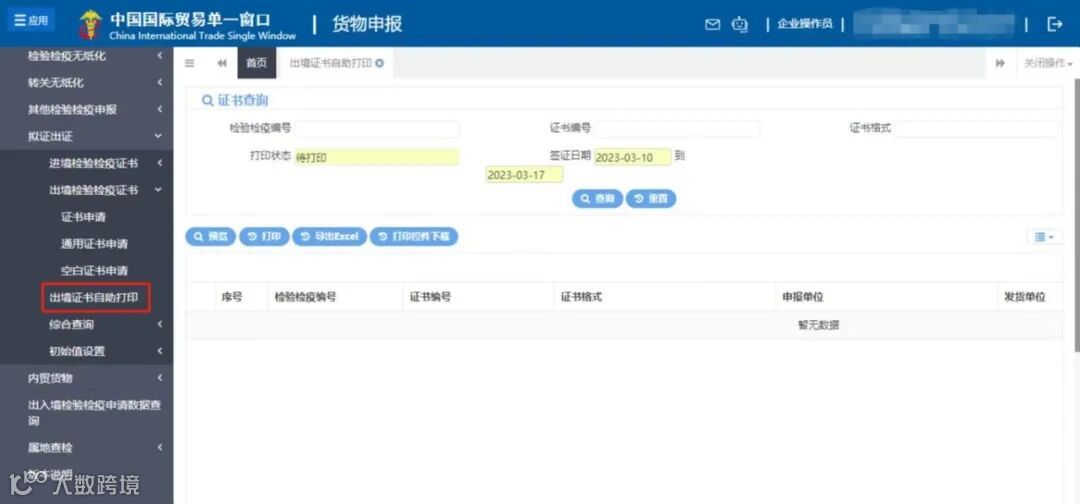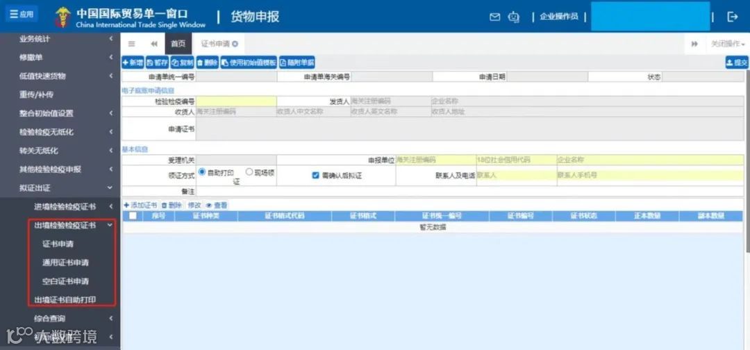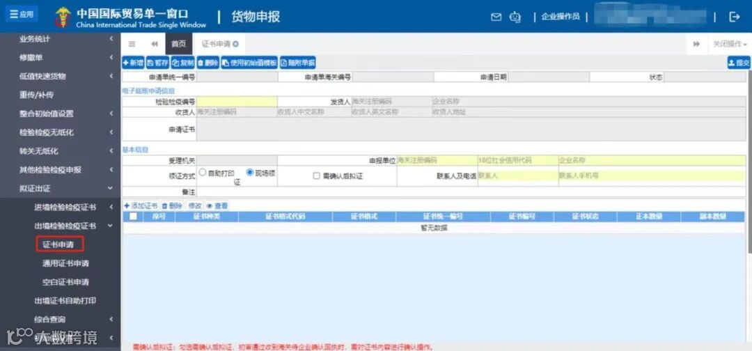必须使用IC卡或Ikey进行登录,否则无法查看拟证出证系统。在取得电子底账后,进入系统,点击拟证出证菜单。企业可通过此系统补充上传相关单据,补充出具证书所需信息,并且可以线上确认海关出具的证书信息。