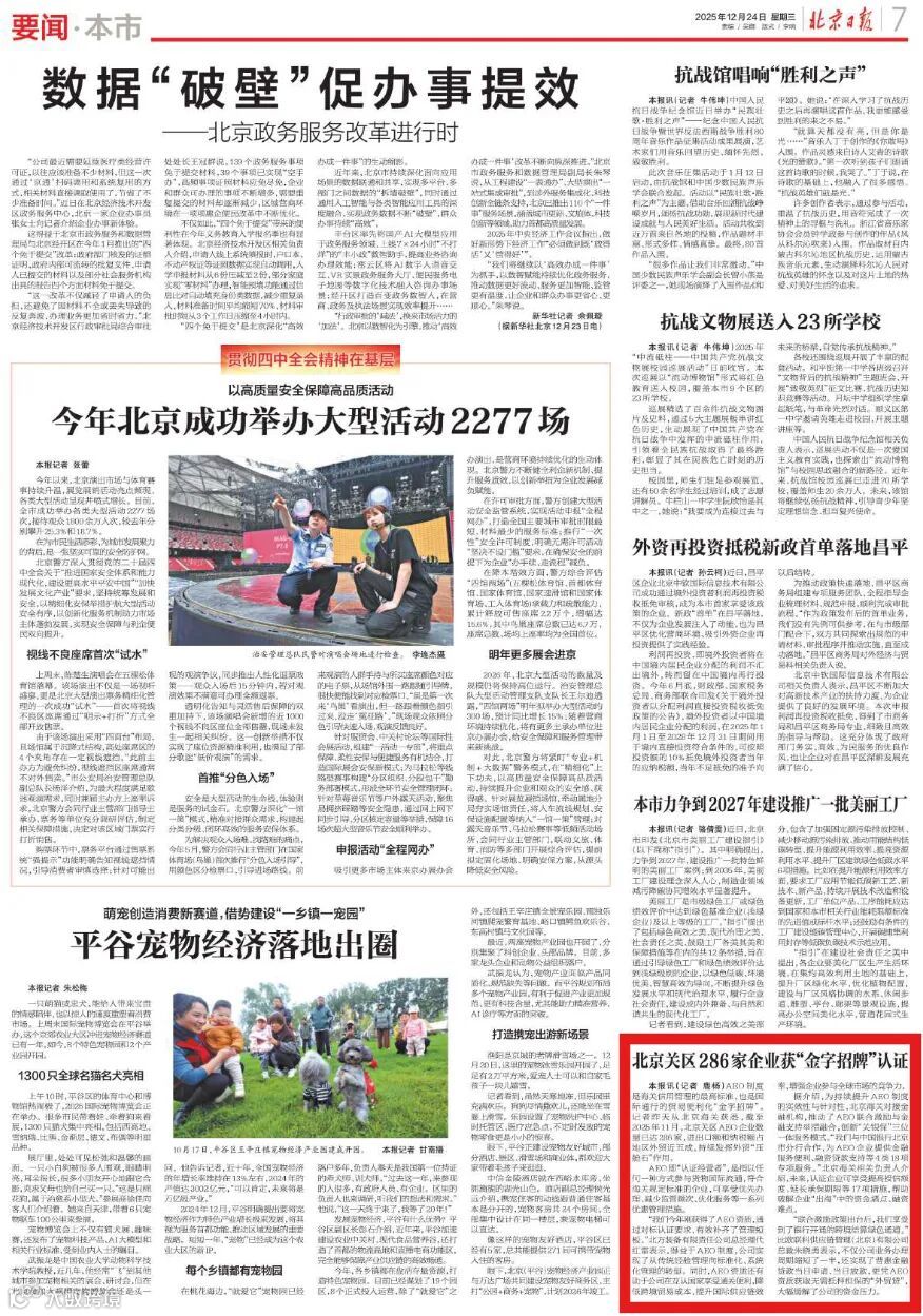 AEO制度是海关信用管理的最高标准,也是国际通行的贸易便利化“金字招牌”。作为国家信用体系建设在海关领域的重要实践,AEO制度历经十一载发展,已成为优化营商环境、促进外贸保稳提质的关键支撑。截至今年11月,北京关区AEO企业数量已达286家,进出口额和纳税额占地区外贸近五成,继续发挥外贸“压舱石”作用,成为畅通国内国际双循环的重要力量。