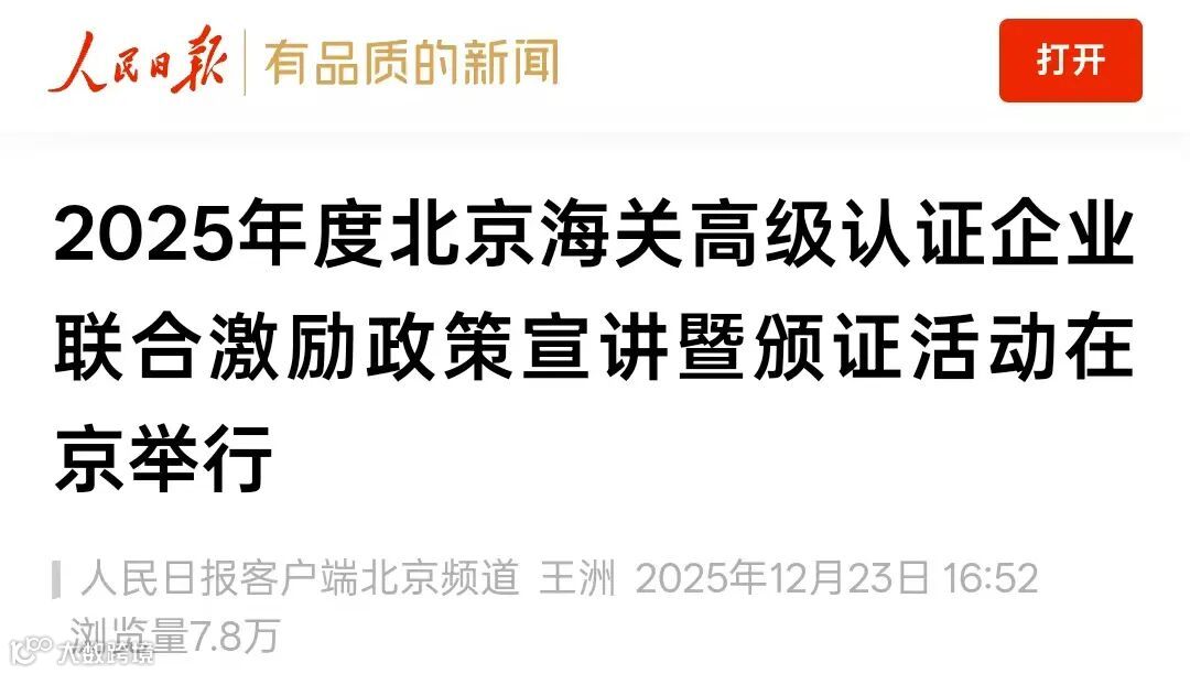 近日,2025年度北京海关高级认证(AEO)企业联合激励政策宣讲暨颁证活动在京举办,本次活动以“以信为帆,踏浪出海”为主题,超百家AEO企业代表参会,20家企业在2025年首次通过海关高级认证。