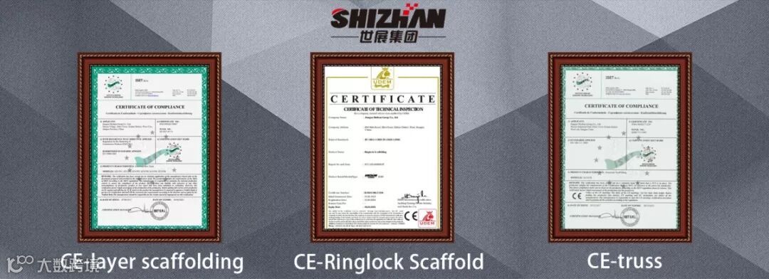 世展到今年七月份已通过三项关键CE认证,圆盘脚手架、铝合金桁架、铝合金圆盘脚手架。其中圆盘脚手架的整个大类通过CE认证现如今在国内行业内也是十分难得的,这是对我们公司整体质量体系的一种肯定!