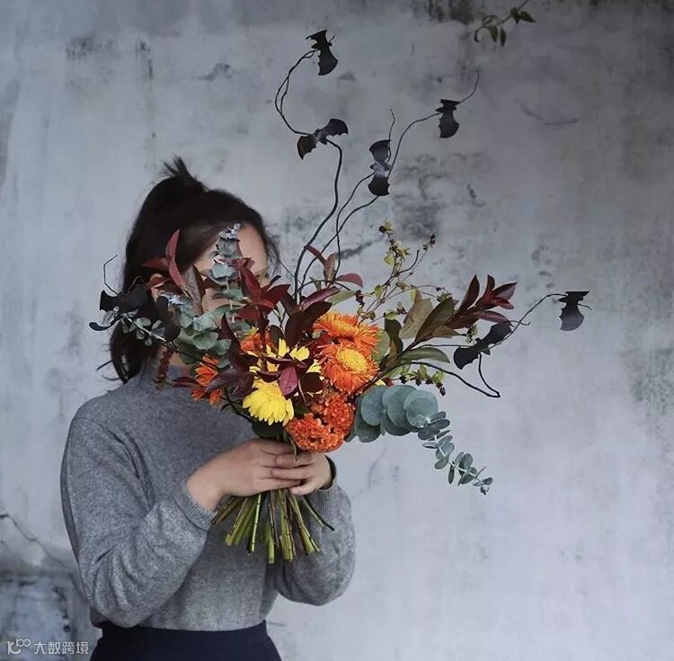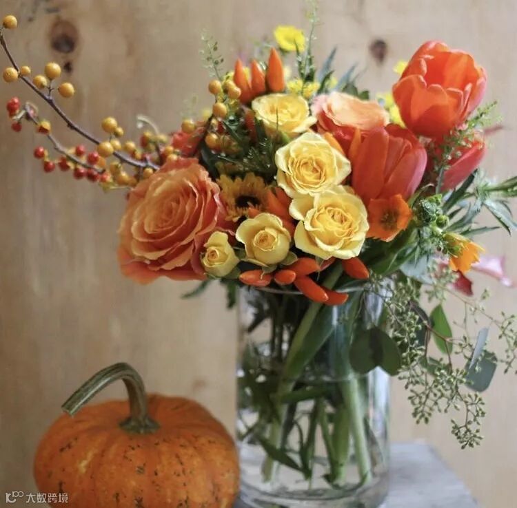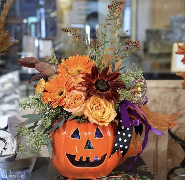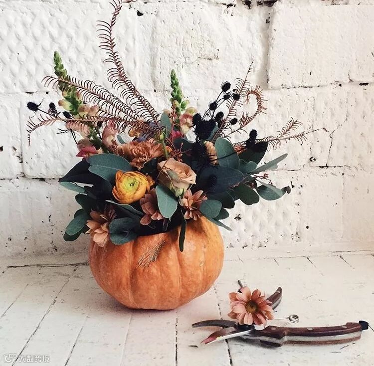 本期花艺沙龙,花艺师将橙黄,橙绿,暖枫叶色等各种颜色交织在一起,装在南瓜里,是被秋日染过色的独特小礼。