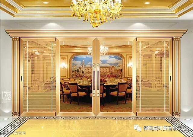 一扇宫廷推拉门,如诗如画的装点,使室内更加高端大气,阳台门与客厅装修形式和风格融为一体,从色调上来讲,阳台门的门框使用金色为主,而客厅的整体色调是以浅色调为主,与客厅统一设计,使得整个客厅看起来更加的金光闪闪、明亮宽敞;从阳台门的形状上来说,阳台门为长方形设计,与客厅长方形的背景墙相互衬托,使得整个客厅的立体感更强;门上加装电动百叶,对室内隐私更有保护。