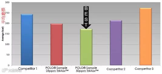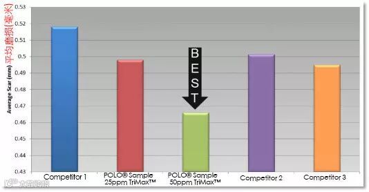 POLO®样品用25ppm的TriMax® 抗磨效果和竞争对手样品相近,而用50ppm 的TriMax®的POLO样品抗磨性能更加出色。
