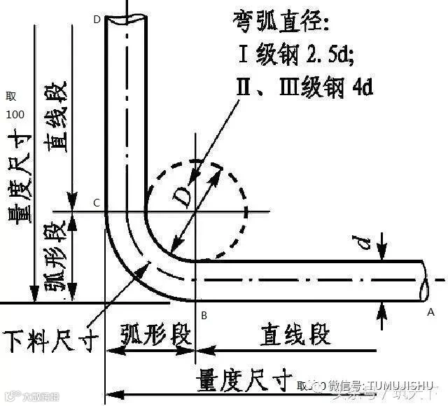 钢筋直径为d,弯曲直径D不小于2.5d,按图集要求取D=2.5d。根据16G101-1第57页规定,CD段平直部分长度为3d。结合下图可明确各段尺寸关系。
