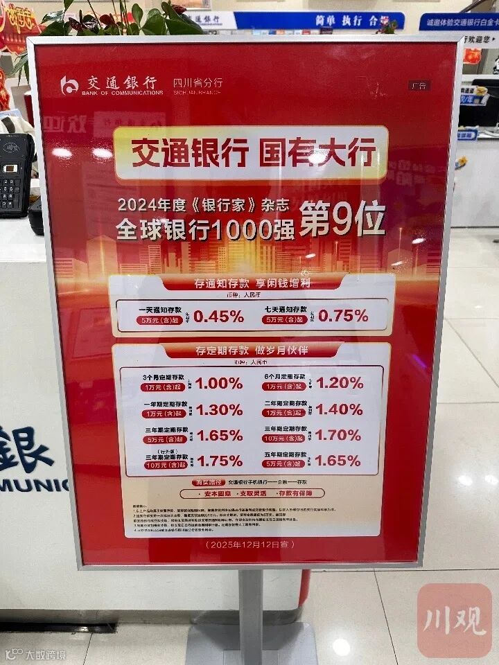 ▲交通银行某网点线下存款利率公示牌。