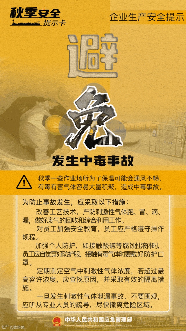 秋季气温降低,有限空间作业风险未减。一些作业场所为了保温可能会通风不畅,有毒有害气体容易大量积聚,造成中毒事故。