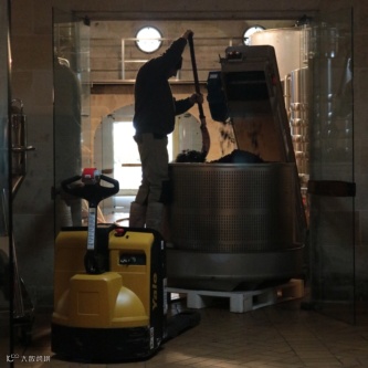 16. 在发酵过程中,可以使用自动化的柱塞把葡萄皮压到液体下面,即机器压皮。有些时候也可以使用长杆子来人工进行这个动作。