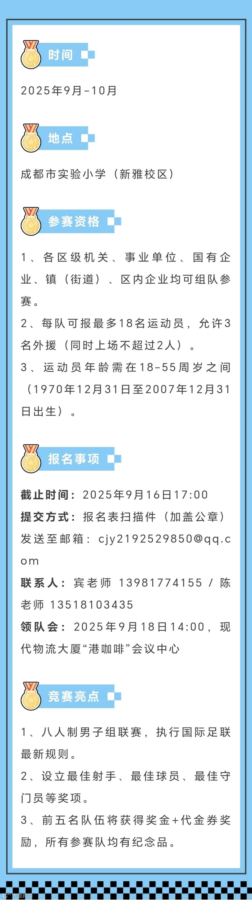 由青白江区文化广电体育和旅游局、成都国际铁路港经济技术开发区管理委员会主办,成都国际铁路港经济技术开发区建设发展有限公司承办,成都市青白江区足球协会执行的2025成都国际铁路港经开区港超联赛(八人制)开始报名啦!